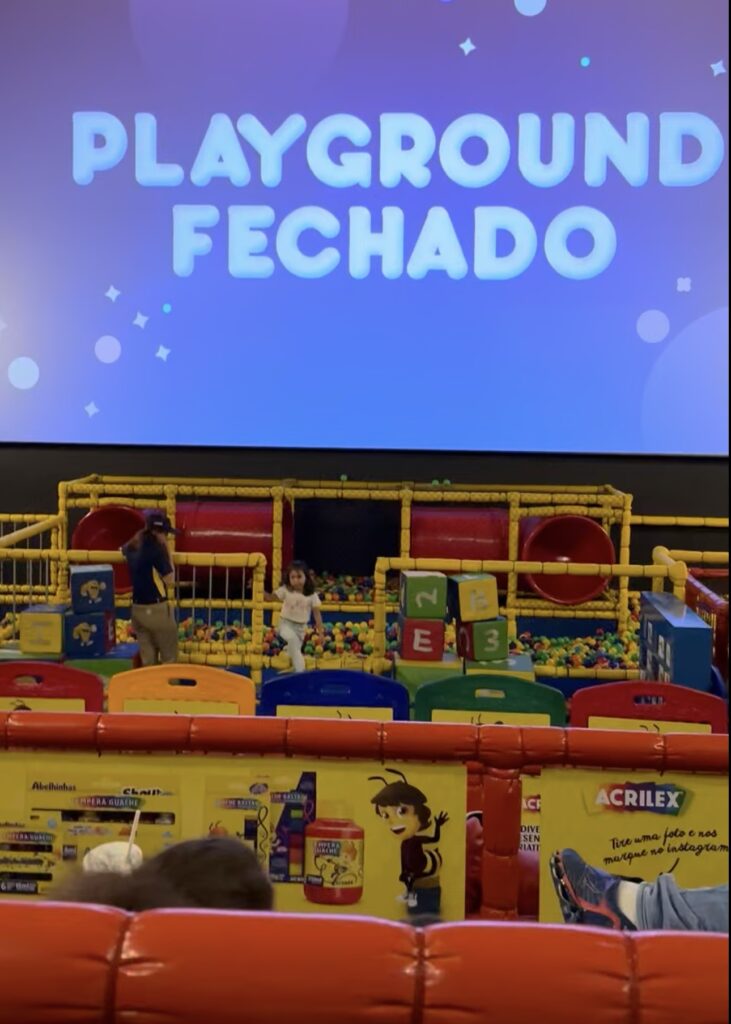 Depois dos 15 minutos que antecedem o filme, aparece uma mensagem tela dizendo que o playground fechado e que o filme vai começar. No intervalo isso se repete.