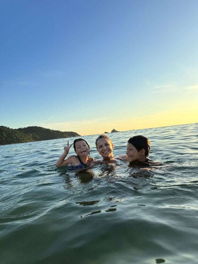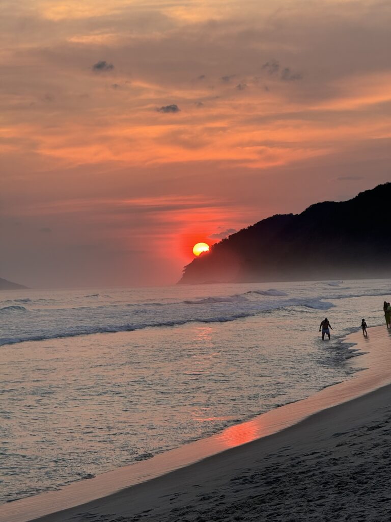 Logo ao lado está a charmosa Paúba, que já é diferente de Maresias. Ela é menor, mais aconchegante, e parece até que a gente se esconde do mundo lá dentro. É uma praia que transmite calma, ideal para desacelerar. E o pôr do sol… que espetáculo! Sempre que estamos lá, fazemos questão de ficar até o final do dia só para ver o céu mudar de cor. Ela é bem mais familiar do que Maresias e o agito do mar é parecido, apesar de já termos pegado o mar lisinho como uma piscina.